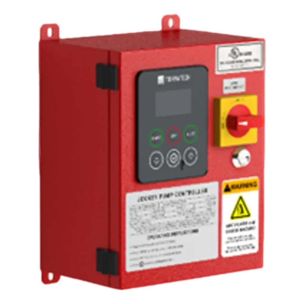 El tablero de bomba jockey incluye lectura de presión del sistema, transductor de presión, ajuste de la presión de desconexión y conexión, pulsadores MANUAL-APAGADO-AUTOMÁTICO, contador de arranques de la bomba, arranque automático por caída de presión, y arranque manual con botón pulsador.